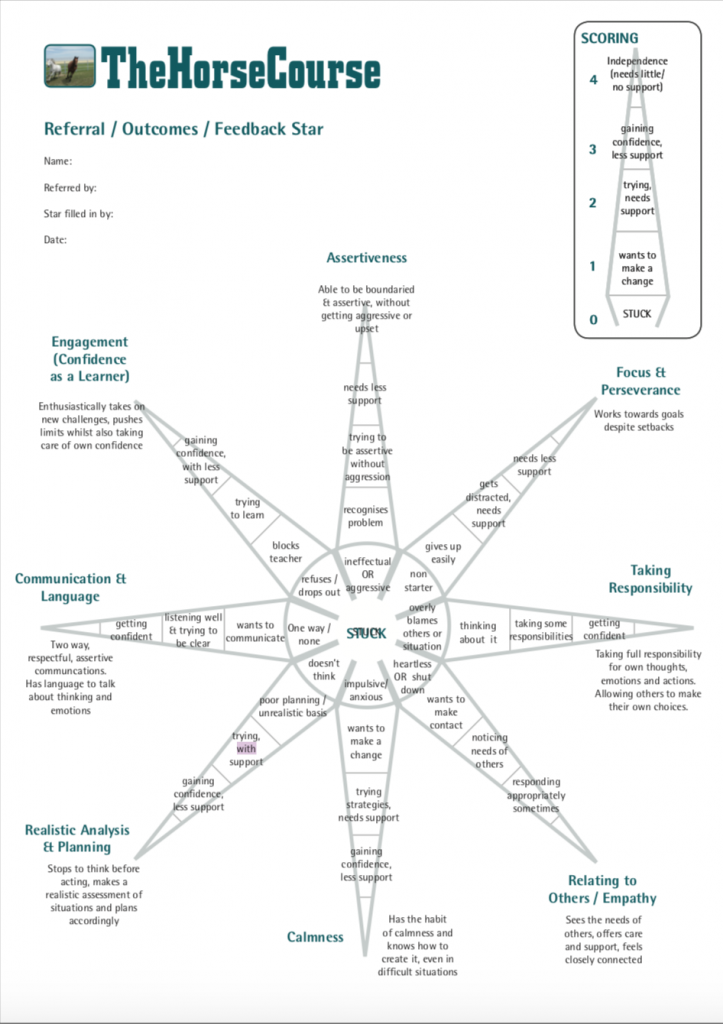TheHorseCourse Star shows the eight areas we work on directly during the course. It is marked up as part of the referral process, later as the basis for discussion of outcomes together with the participant and finally as part of the feedback from referrers 2 months post-intervention.